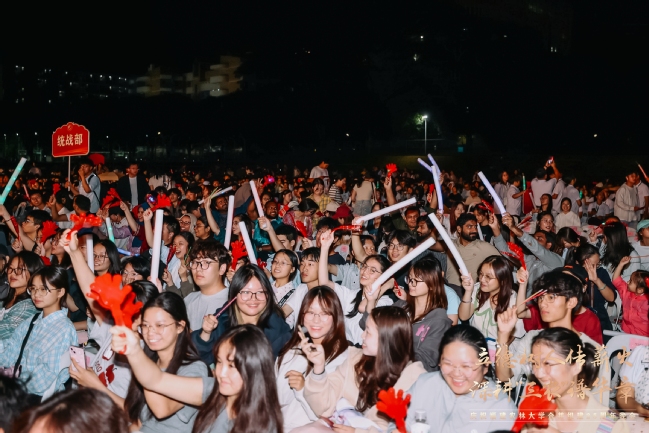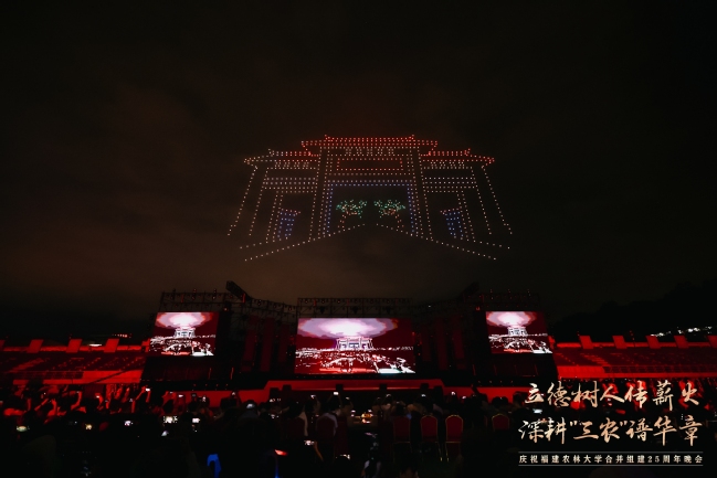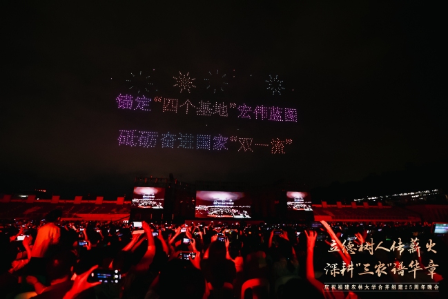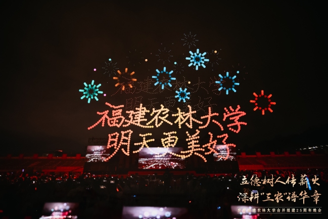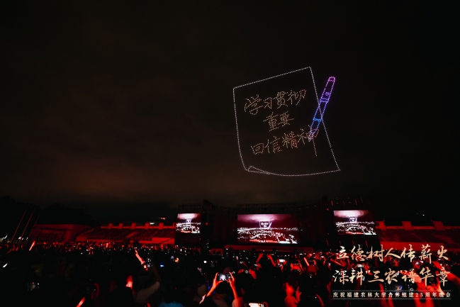 震撼的无人机表演引起现场观众的共鸣,1000架无人机以夜空为幕,依次绘就了学校1936年与1940年的办学起点、2000年合并组建的历史时刻、熠熠生辉的校徽与校训、立体的“25”周年标识、学习贯彻重要回信精神等12幅光影画卷,表达了学习贯彻习近平总书记重要回信精神的决心和对学校明天更美好的真挚祝福。