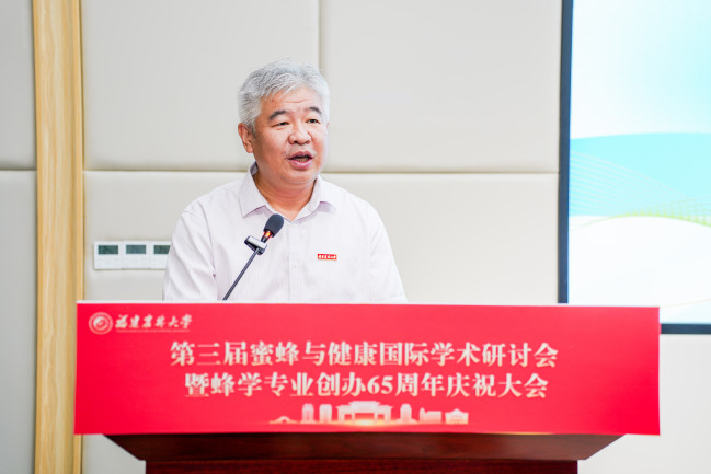 庞国芳以荣誉教授身份为大会送上视频祝福。他如数家珍地回顾了蜂学专业创办65年来取得的累累硕果,表示学院研发的“蜜蜂电子取毒器”、神蜂精、蜂产业提质增效关键技术研发与应用等科研成果助力蜂产业在满足群众生活需要、促进农业绿色发展、保护修复生态环境、助力加速乡村振兴等方面发挥了重要作用,这一产学研用深度融合的发展路径,生动诠释了“小昆虫服务大战略”的深刻内涵。