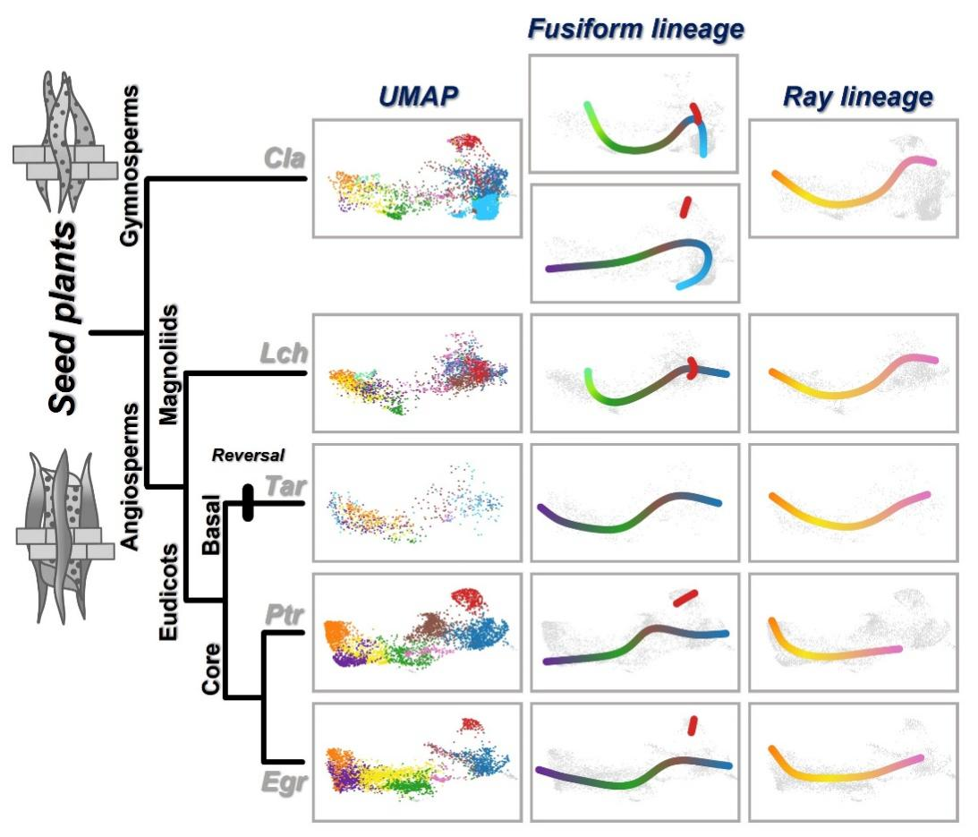 木质部作为地球上最庞大的生物量,其形成依赖于种子植物特有的次生生长。种子植物中的次生木质部由两个系统组成:径向系统(向内和向外生长)和轴向系统(向上和向下生长)。裸子植物和被子植物是种子植物中两个演化支系。它们的径向系统均由射线薄壁组织细胞(ray parenchyma cell)构成。在轴向系统中,被子植物轴向系统由导管分子(vessel element)和韧型纤维(libriform fiber)组成分别执行水分运输和机械支撑的功能,而裸子植物仅含有的管胞(tracheid)能够同时执行这两种功能。近期在被子植物中的两项研究,通过单细胞RNA测序发现被子植物中轴向系统中的发育谱系存在两种变异(真双子叶类和木兰类),而射线薄壁组织细胞的径向发育谱系则是保守的。而裸子植物木质部的发育仍有待破解,它的发育程序是否与被子植物一致还是不一样?这些是植物学家对于木质部发育致力探索的未知谜团。