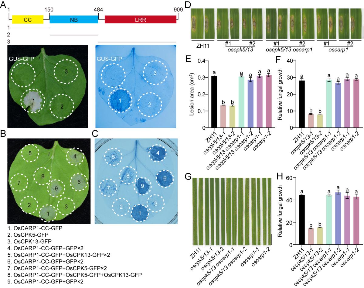 随后,该研究构建了oscpk5/13双突变体,发现双突变体中早期免疫反应(包括活性氧ROS迸发和胼胝质沉积)均显著降低,并且oscpk5/13双突变体的胼胝质沉积较oscpk5和oscpk13单突变体更少,表明OsCPK5和OsCPK13功能上存在加性效应。该结果与OsCPK5和OsCPK13存在相互作用,且可以相互磷酸化相一致。然而,有趣的是,与oscpk5和oscpk13单突变体不同,oscpk5/13双突变体表现出增强的稻瘟病抗病表型。进一步的研究发现,OsCPK5和OsCPK13与NLR抗病蛋白OsCARP1相互作用,且抑制OsCARP1诱导的烟草细胞死亡。同时,oscpk5/13双突变体增强的抗病表型依赖OsCARP1 (图2)。