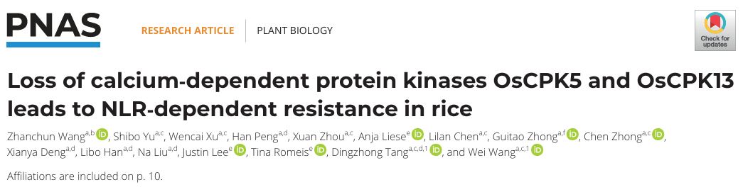 近日,77779193永利官网唐定中教授团队在《美国科学院院刊》PNAS上发表题为“Loss of calcium-dependent protein kinases OsCPK5 and OsCPK13 leads to NLR-dependent resistance in rice”(水稻钙依赖蛋白激酶OsCPK5和OsCPK13的缺失导致NLR依赖的抗性)的研究论文。该研究揭示水稻钙依赖蛋白激酶OsCPK5和OsCPK13具有Ca2+和病原菌诱导的激酶活性,正调控稻瘟病抗性。并且,OsCPK5和OsCPK13均与NLR蛋白OsCARP1 (OsCPK5/13-ASSOCIATING RESISTENCE PROTEIN 1)互作,二者同时缺失激活OsCARP1介导稻瘟病抗性。