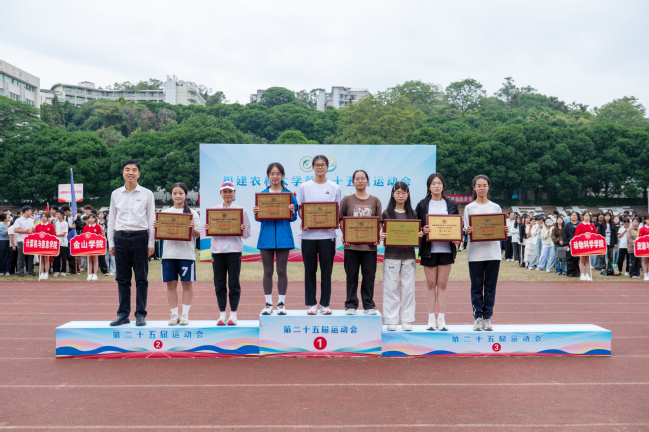 林庆藩副校长为获得学生女子组田径团体总分前八名的代表队颁奖