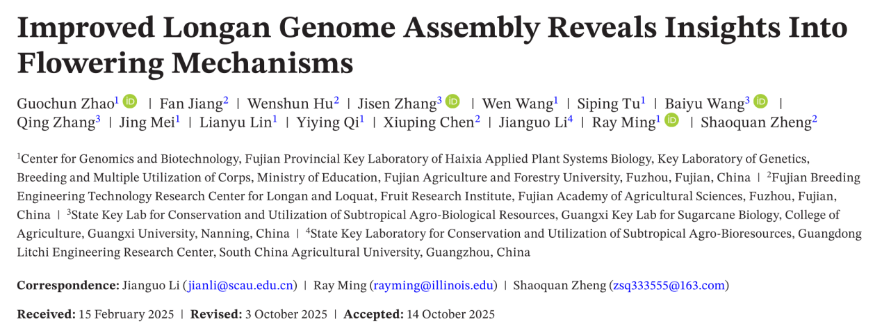 近日,77779193永利官网海峡联合研究院明瑞光团队联合福建省农科院果树所郑少泉团队、华南农业大学园艺学院李建国团队在《植物生物技术杂志》Plant Biotechnology Journal 杂志在线发表题为“Improved longan genome assembly reveals insights into flowering mechanisms”(改进的龙眼基因组组装揭示其开花机制新见解)的研究论文。该研究完成了龙眼主栽品种‘石硖’的高质量基因组组装,并系统解析了自然开花与KClO₃诱导开花的分子调控网络。