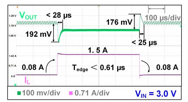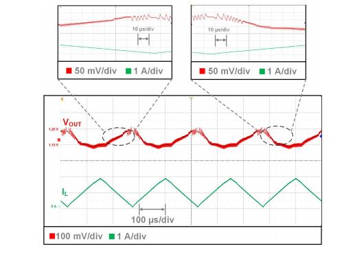 实测显示 (图4),转换器不仅能实现无缝平稳的模式转换,其在0.08-1.5A负载跳变时输出电压尖峰小于192mV,恢复时间仅28μs ,有效满足了智能终端对电源高效率、高稳定性的严苛需求。
