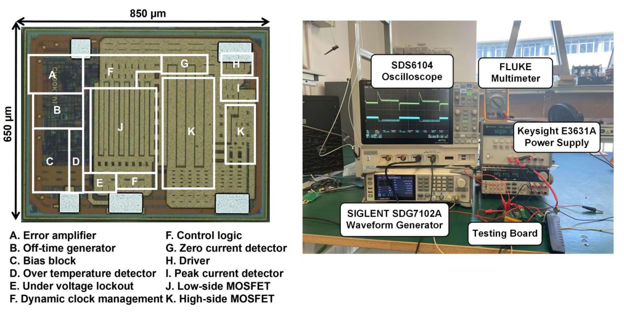 芯片测试环境和芯片裸片如图3所示,在0.18μm工艺下,芯片面积仅0.5525 mm² ,却展现出卓越性能:2.5-3.6V输入电压下稳定输出1.2V,峰值效率达93.7%(0.4A负载),轻载1mA时效率仍保持80.5%,且负载瞬态响应速度快、纹波低,综合品质因数达7.26μs/(A/mm²),为便携式电子设备电源方案提供了关键技术支撑。