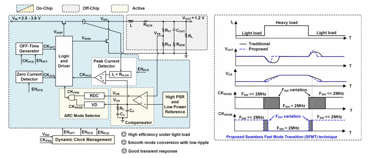 针对这一核心需求,李景虎、罗志聪教授团队近日在电路与系统领域顶级期刊《IEEE Transactions on Circuits and Systems I: Regular Papers》发表题为 “A High Efficiency Dual Mode Buck Converter With a Novel Seamless and Fast Transition Scheme”(一种具有新型无缝快速过渡方案的高效双模降压转换器)的研究论文。该研究提出的双模降压转换器不仅具备高能量转换效率,更通过创新的无缝快速过渡方案,实现了不同工作模式间的无扰平稳切换。同时,转换器在宽负载范围内展现出良好的动态响应特性,为边缘AI终端等设备的电源管理芯片设计提供了全新解决方案。厦门亿芯源半导体科技有限公司、星网锐捷通讯股份有限公司结合产业实际需求,推动该技术落地产品化,加速科研成果向市场价值转化。
