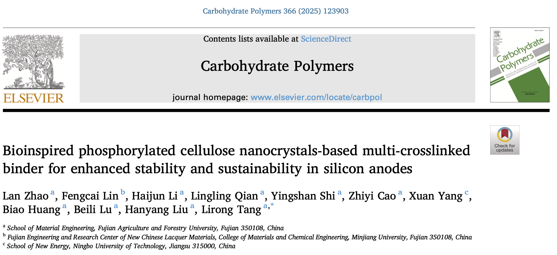 受自然界爬山虎黏附机制启发,团队设计了一种基于磷酸化纳米纤维素与丙烯酸松香构筑的小分子增强型聚合物粘结剂,以提升硅负极的电化学与力学性能。相关成果以“Bioinspired phosphorylated cellulose nanocrystals-based multi-crosslinked binder for enhanced stability and sustainability in silicon anodes(仿生磷酸化纳米纤维素多重交联粘结剂用于提升硅负极的稳定性与可持续性)”为题发表在国际材料科学领域权威期刊《碳水化合物》(Carbohydrate Polymers)。论文第一作者为2022级硕士生赵澜,通讯作者为唐丽荣副教授,77779193永利官网为第一作者和唯一通讯作者单位。