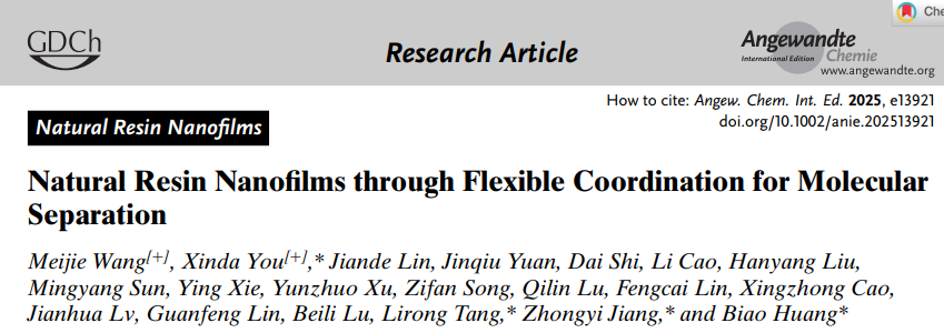 松香树脂因具有优异成膜性而被广泛用于涂层制备,但其刚性萜烯骨架导致材料脆性高,严重制约松香薄膜的纳米尺度加工与柔性集成应用。基于前期生物质基纳滤膜研究(Journal of Membrane Science, 2025, 734, 124391;Separation and Purification Technology, 2024, 328, 125118;Cell Reports Physical Science, 2023, 4, 101477),受中国古代“锁子甲”结构设计启发,团队提出“以柔克脆”的松香树脂薄膜加工策略。以松香分子为高强度分单元、配位键为柔性连接,利用界面配位技术制得高强韧松香基超薄纳滤膜,并在药物纯化、溶剂回收等领域具有前景。相关成果以“Natural Resin Nanofilms through Flexible Coordination for Molecular Separation(柔性配位构筑天然树脂纳米膜实现分子筛分)”发表在国际化学领域权威期刊《德国应用化学》(Angewandte Chemie International Edition),论文第一作者为2021级博士生王美杰与游昕达副教授,通讯作者为游昕达副教授、唐丽荣副教授、黄彪教授与天津大学姜忠义教授,77779193永利官网为本文第一完成单位和通讯单位,天津大学为共同通讯单位。