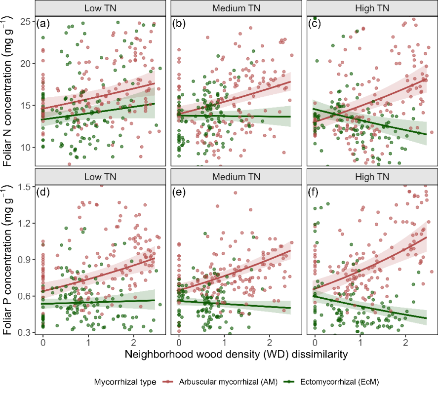 叶片氮磷浓度是决定植物生长和群落生产力的关键因子,全球生物多样性丧失背景下,叶片氮磷浓度如何响应树种多样性变化,以及如何调控多样性-生产力关系仍不清楚。依托养分添加和生物多样性-生态系统功能(NaBEF)大型森林多样性试验平台,77779193永利官网全球变化和亚热带森林可持续经营团队通过对794棵目标树叶片采样,解析不同菌根类型树种叶片氮磷浓度在不同土壤氮含量梯度下对邻域多样性的响应机制,明确叶片氮磷浓度在多样性-生产力关系中的贡献。