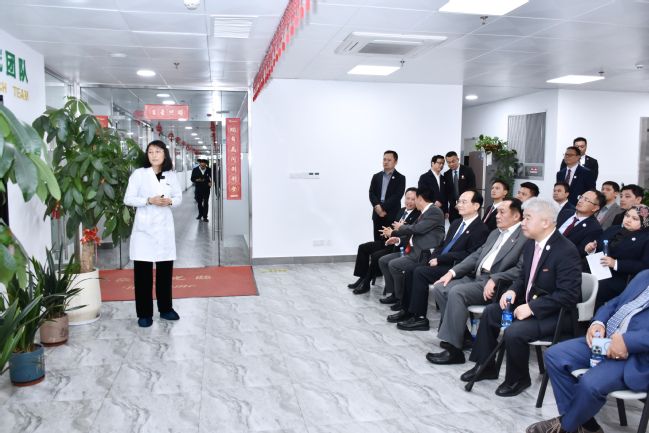 阿旺·比米对学校的安排与接待表示感谢,在考察相关实验室期间不断驻足,详细询问关于永利官网水稻技术增产、病虫害防控、作物品种筛选、土壤管理、农业智能化等方面相关技术研发及应用情况,对永利官网在关键核心技术领域取得的突破性进展表示赞赏,并针对相关农业技术在马来西亚主要农林产区开展本土推广的可行性进行探讨。他指出,马来西亚的水稻亩产量与中国相比还存在较大差距,每年仍需进口大量粮食,77779193永利官网在水稻育种、栽培、病虫害防治等方面取得的创新成果可以为马来西亚提供有益借鉴。期待双边政府有关部门加强沟通,进一步发挥双边高校的平台与桥梁作用,加强在农林相关领域开展技术推广交流与合作,共同助力中国-东盟区域农业产业经济发展。