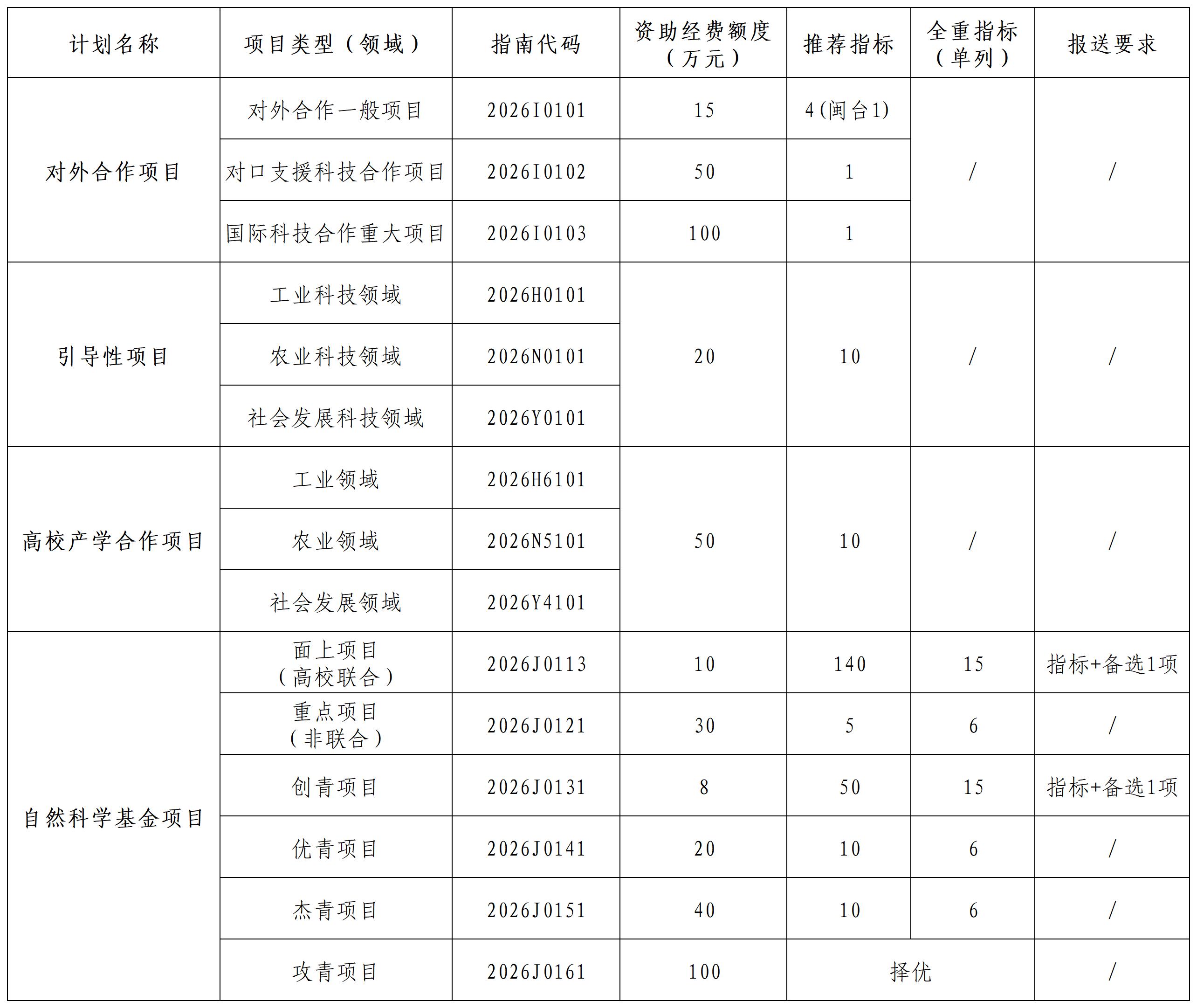 福建省科学技术厅关于组织申报2026年度第一批省科技计划和奖补项目的通知(闽科资〔2025〕7号)