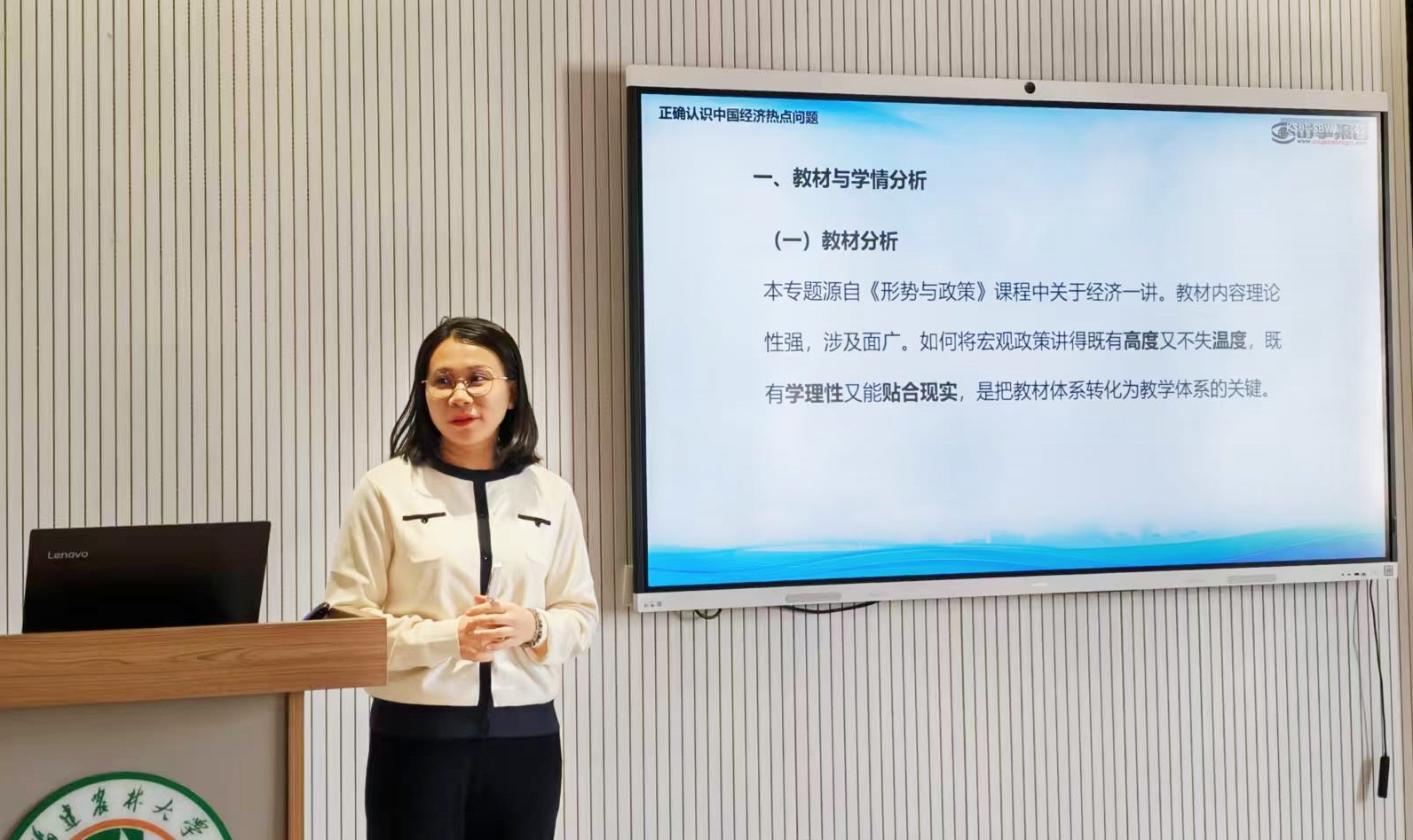 雷娜老师以“形”和“势”为要点,通过具体案例系统阐述了“应对外部冲击的能力底气何来、为何要促进民营经济发展壮大、做强国内大循环如何实现”三个问题,随后教师刘淑兰、叶静做教学点评,她们认为,本次授课紧扣中央精神,政治导向鲜明,内容有厚度、视野有广度、育人有温度,为在场的师生带来了精彩的教学示范。