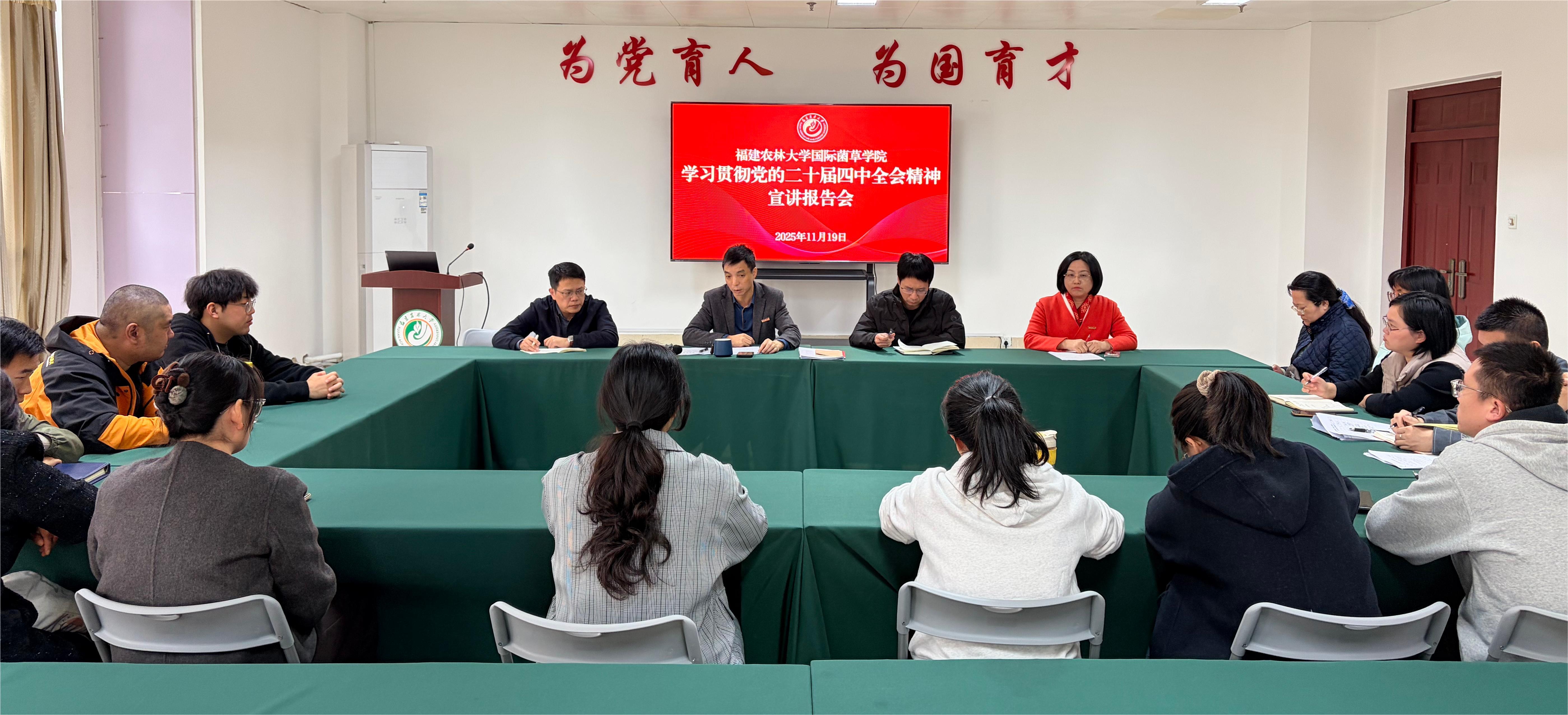 11月19日下午,国际菌草学院在金综楼B401会议室举行学习贯彻党的二十届四中全会精神宣讲会。学院全体教职工参加学习,院党委书记池有忠作专题宣讲。