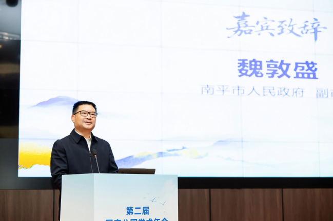 魏敦盛在致辞中感谢各界支持,介绍了南平市优质的生态资源和深厚的历史文化底蕴,并介绍了该市通过创新局地联动与司法协作机制强化生态保护,推动法治化治理进程。