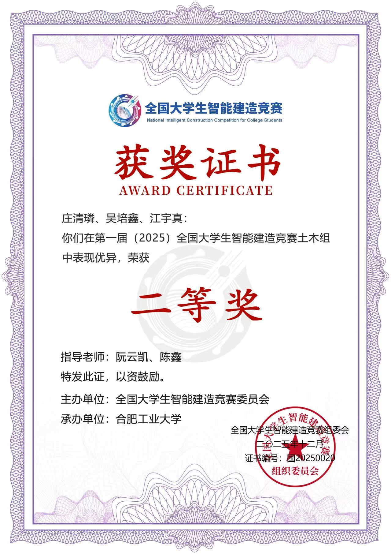 2025年12月5-7日,首届全国大学生智能建造竞赛在合肥工业大学举行。本次竞赛聚焦“数字孪生·智慧场景”核心主题,吸引全国21所高校47支代表队、近230名师生同台竞技。经过两天激烈角逐,永利官网交通与土木工程学院派出的两支队伍凭借出色的创新思维与扎实的实践能力,分别斩获土木组二等奖与交通组二等奖的优异成绩。