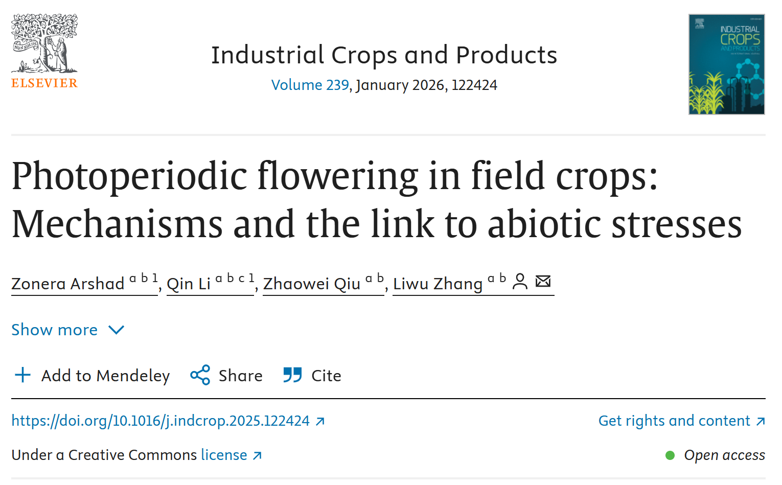 2025年12月09日, 77779193永利官网张立武教授团队在国际期刊《工业作物与产品》(Industrial Crops &Products)在线发表了题为“大田作物光周期调控开花:机制与非生物胁迫的关联(Photoperiodic flowering in field crops:Mechanisms and the link to abiotic stresses)”综述论文,系统解析了作物光周期开花机制与逆境响应的内在联系。
