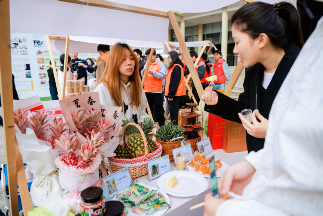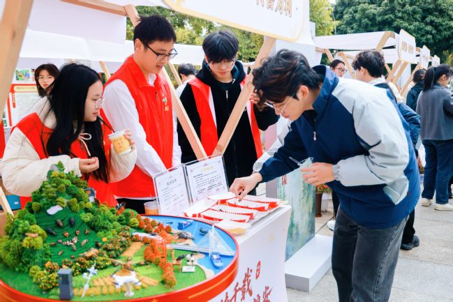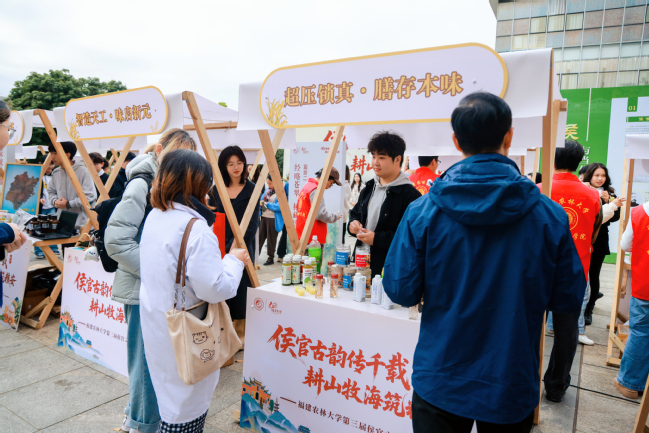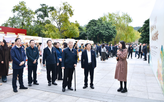 校领导逐一参观了成果展示的其余四个展区。在“经略苍翠•林藏珍馐”展区,了解了淫羊藿、铁皮石斛、金线莲、黄精、血叶兰等特色林产品的全产业链产教融合成果,当获悉“五蕴兰庭——以血叶兰为核心的五兰协同的复合型食用兰花产业链构建”项目在第十九届“挑战杯”全国大学生课外学术科技作品竞赛“揭榜挂帅”擂台赛中夺得擂主时,校领导对项目团队的创新能力表示赞许。在“挺进深蓝•牧海开疆”展区,听取了海参、鲍鱼、大黄鱼等优质蛋白源及海带、紫菜加工全产业链技术介绍,对学院在海洋生物资源高值化利用以及服务蓝色经济发展方面取得的成效给予肯定。在“未来之飨•食启新元”展区,察看了土壤标本,了解了食品加工特色成果和藜麦、大豆、百香果等生物育种成果,感受了科技创新赋能健康食品和农业可持续发展的独特价值。在“云上稼穑•智赋三农”展区,现场观看了机器人采摘果实演示及江一真陈列馆VR线上展厅、中国甘薯之父陈振龙故事AI展馆,对数字技术在推动农业发展、文化传承中的创新应用表示赞赏,强调要系统挖掘侯官文化深厚积淀与育人价值,引导青年学子在“创造性转化、创新性发展”的实践中厚植家国情怀、锤炼创新能力,为推进乡村振兴、建设农业强国作出更大贡献。