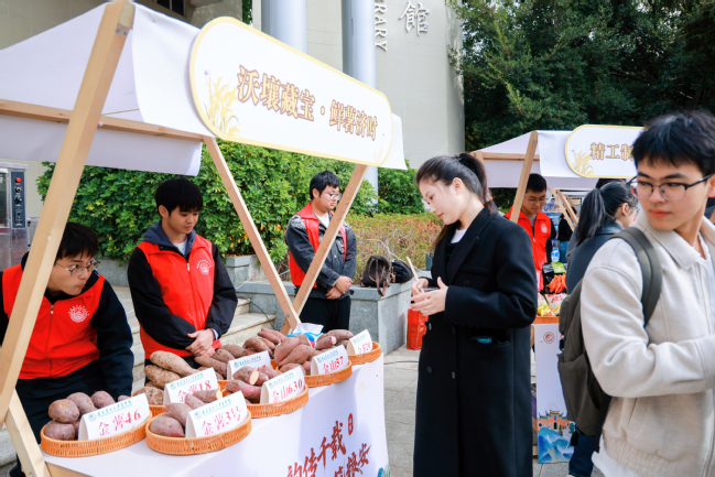 校领导还参观了互动体验与成果展示。在“深耕沃土·粮安九州”展区,展示了学校在甘薯种质资源保护、脱毒种苗繁育、绿色栽培及精深加工领域的全产业链产教融合成果。校领导现场品尝了永利官网选育的甘薯,并询问是否在连城推广种植。现场的杨志坚老师介绍到,团队育成的“金山630”这一红心地瓜干加工专用新品种,2006年通过福建省品种审定后,迅速在连城落地生根,如今已占据当地甘薯栽培面积的80%以上,解决了传统品种“优质不高产、高产不优质”的矛盾,为“世界地瓜之都”的产业升级注入核心动力。随着该品种的推广,连城地瓜产业形成了从标准化种植到精深加工的完整链条,带动当地超10万人从事甘薯相关产业,地瓜制品拓展出十大系列160多个品种,全产业链产值突破174亿元,真正实现“一根地瓜富半县”。此外“金山57”凭借高产、稳产、适应性广、抗逆性强的突出优势,成为福建省及我国南方区甘薯主栽品种,累计推广种植超1000万亩,直接新增社会效益超10亿元。校领导对学校甘薯团队取得的成绩给予充分肯定,勉励团队弘扬侯官先贤的为民情怀与开拓精神,继续聚焦甘薯品种改良与产业升级,培育更多优质、高效、绿色的“中国芯”甘薯品种,推动科技创新与产业创新深度融合,诠释“一个品种兴一方产业”的育种力量,为服务乡村振兴和保障国家粮食安全提供更坚实的科技支撑。