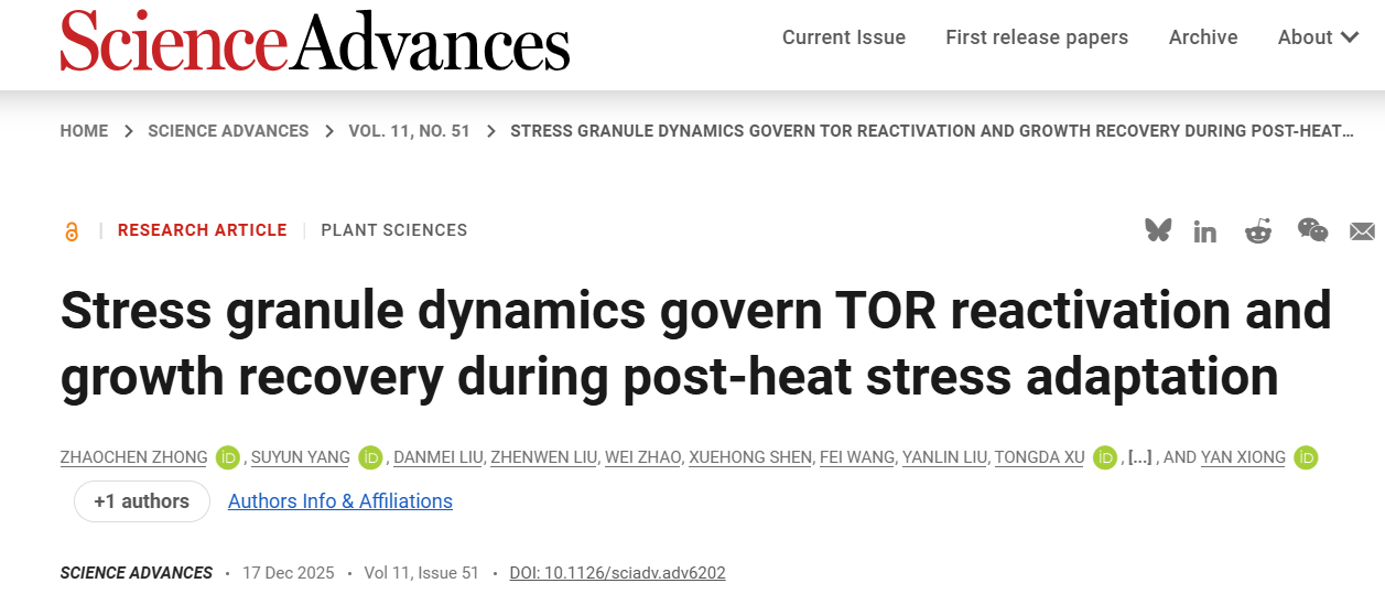 近日,永利官网熊延教授团队在期刊《科学进展》Science Advances上发表了题为“Stress granule dynamics govern TOR reactivation and growth recovery during post-heat stress adaptation”(应激颗粒动态调控热胁迫后应激适应过程中TOR激酶的再激活与生长恢复)的研究论文,揭示了植物在热胁迫适应过程中应激颗粒与TOR信号通路之间的调控机制。
