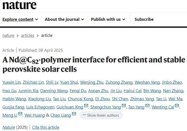 35、4月8日,永利官网材料工程学院绿色光电器件与储能电池团队青年教师林智超以共同第一作者身份Nature发表题为《一种钕内嵌富勒烯-聚合物偶联层作为高效稳定钙钛矿太阳能电池界面层》“A Nd@C82-polymer interface for efficient and stable perovskite solar cells”的研究成果,为制备性能和稳定性兼优的钙钛矿太阳能电池提供了新思路。