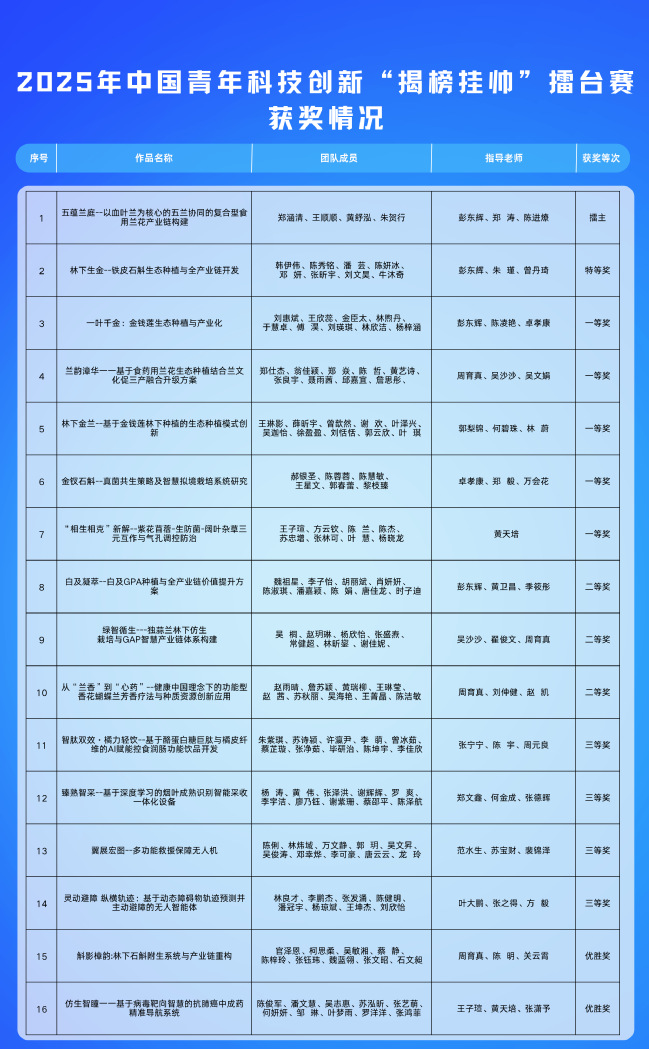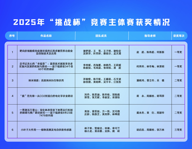 117、11月,共青团福建省委、福建省青年联合会授予一批2025年度福建青年五四奖章、福建新时代青年先锋和“两红两优”表彰对象。学校荣获5项表彰,其中,77779193永利官网农林生物安全全国重点实验室团队获“福建青年五四奖章集体”,海峡联合研究院(未来技术学院)王琴教授和植物保护学院吴升晏教授2位老师获“福建青年五四奖章”,公共管理与法学院2023级公共管理专业研究生吴松泽同学获“福建省优秀共青团员”,校团委谢国富老师获“福建省优秀共青团干部”。