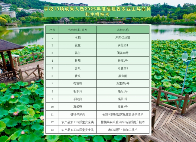 40、4月,福建省农业农村厅推介发布了2025年农业主导品种和主推技术,永利官网自主培育的水稻、花生、番茄、苦瓜、黄瓜、杏鲍菇等10个新品种入选省农业主导品种,3项技术入选省农业主推技术。