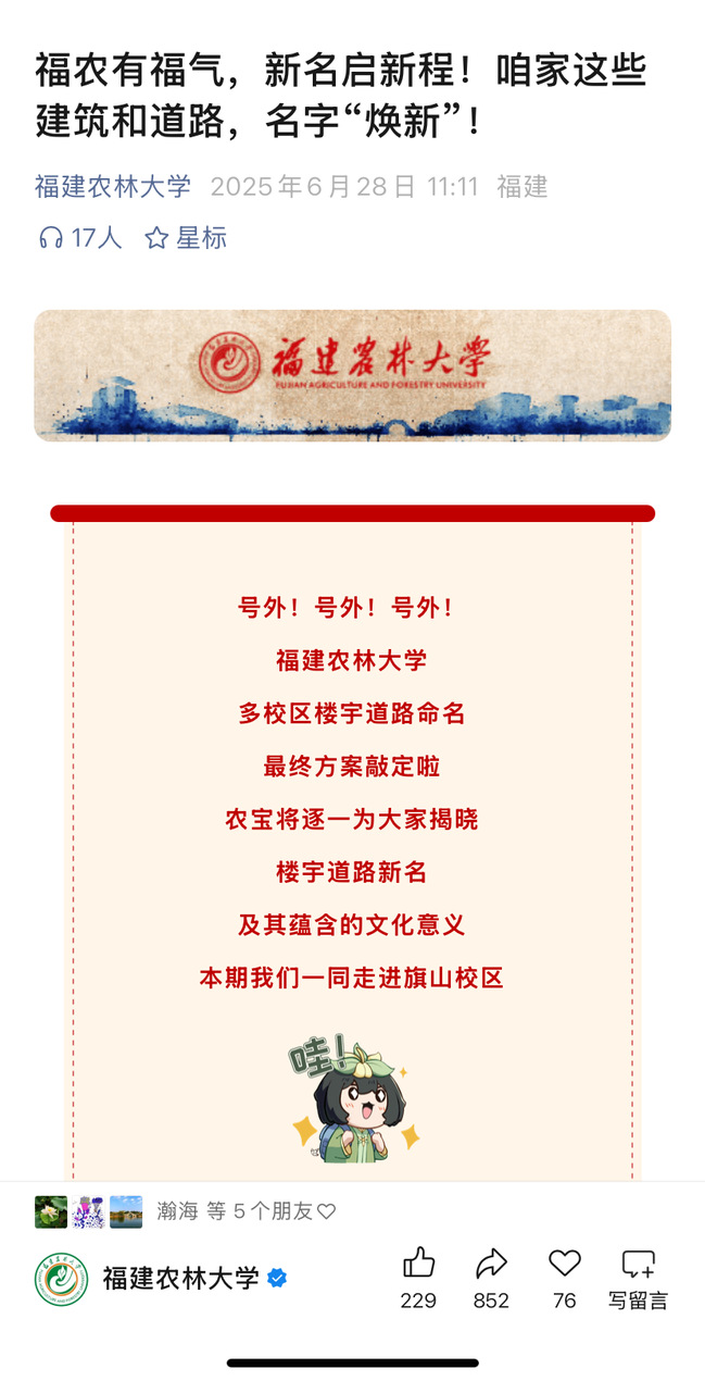 24、3月23日-6月9日,学校开展多校区楼宇、道路命名征集活动,并公布了多校区楼宇道路的新命名,进一步完善校园文化标识,提升学校人文气质。