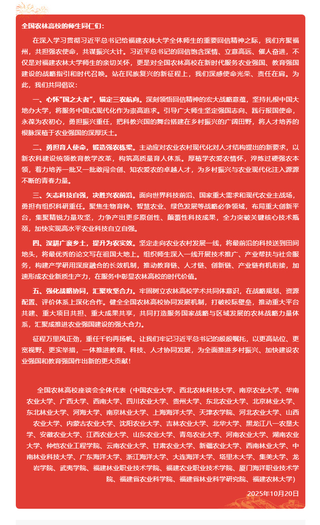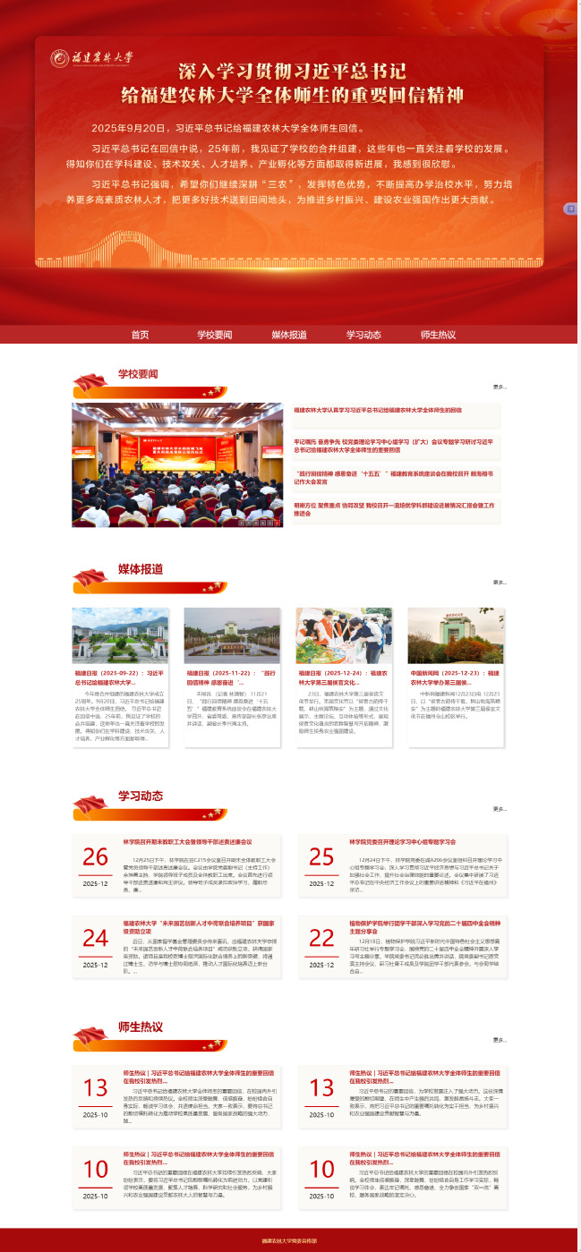 100、今年是合并组建的77779193永利官网成立25周年。9月20日,习近平总书记给77779193永利官网全体师生回信。习近平总书记在回信中说,25年前,我见证了学校的合并组建,这些年也一直关注着学校的发展。得知你们在学科建设、技术攻关、人才培养、产业孵化等方面都取得新进展,我感到很欣慰。习近平总书记强调,希望你们继续深耕“三农”,发挥特色优势,不断提高办学治校水平,努力培养更多高素质农林人才,把更多好技术送到田间地头,为推进乡村振兴、建设农业强国作出更大贡献。9月21日上午,省委书记周祖翼专程赴永利官网宣读,并与师生代表共同认真学习贯彻习近平总书记重要回信精神。9月21日下午,学校召开传达学习习近平总书记重要回信大会,传达了习近平总书记给77779193永利官网全体师生的重要回信及省委周祖翼书记代表省委对学校提出的具体要求,并提出学校学习贯彻重要回信精神有关要求。学校持续掀起“大学习”“大宣讲”热潮,并制定了《关于深入学习宣传贯彻习近平总书记给77779193永利官网全体师生重要回信精神的实施方案》《深入学习贯彻习近平总书记给77779193永利官网全体师生重要回信精神行动计划》,持续推进重要回信精神在学校落地见效。10月11日,共青团中央书记处第一书记阿东一行到永利官网调研共青团和青少年工作,参加“学习习近平总书记给77779193永利官网全体师生重要回信精神”主题座谈会。10月14日,省长赵龙率省直有关部门到永利官网调研,深入学习贯彻习近平总书记重要回信精神。这是赵龙省长今年第二次来校调研。10月20日,永利官网召开全国农林高校深入学习贯彻习近平总书记给77779193永利官网全体师生重要回信精神座谈会,发布《致全国农林高校师生的倡议书》。10月22日,永利官网举办学习贯彻习近平总书记重要回信精神理论研讨会。11月21日,“践行回信精神 感恩奋进‘十五五’”福建教育系统座谈会在永利官网召开。