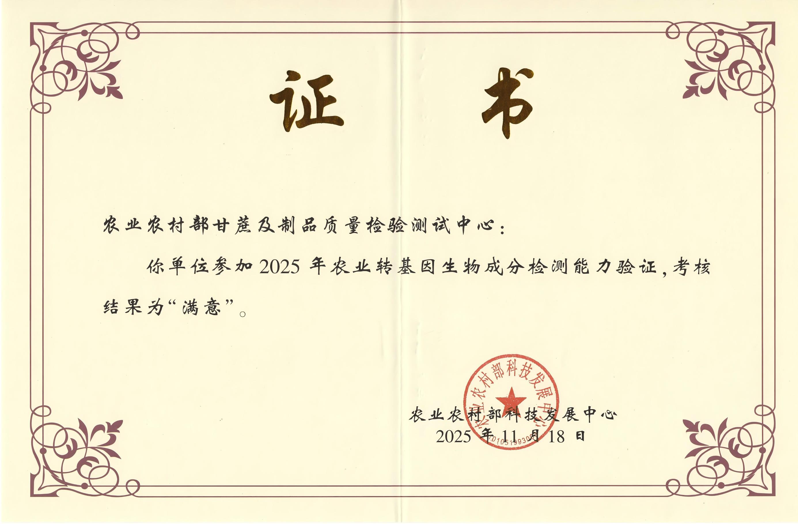 转基因生物成分检测能力验证是评价转基因检测机构检测能力的关键环节。本次能力验证涵盖转基因定性与定量检测项目,中心严格遵循标准操作流程,确保数据准确可靠,按时完成检测任务并提交检验报告。经考核评估,中心获评“满意”等级,农业农村部科技发展中心颁发了证书。充分彰显了中心在转基因检测领域的技术优势与质量管理水平。