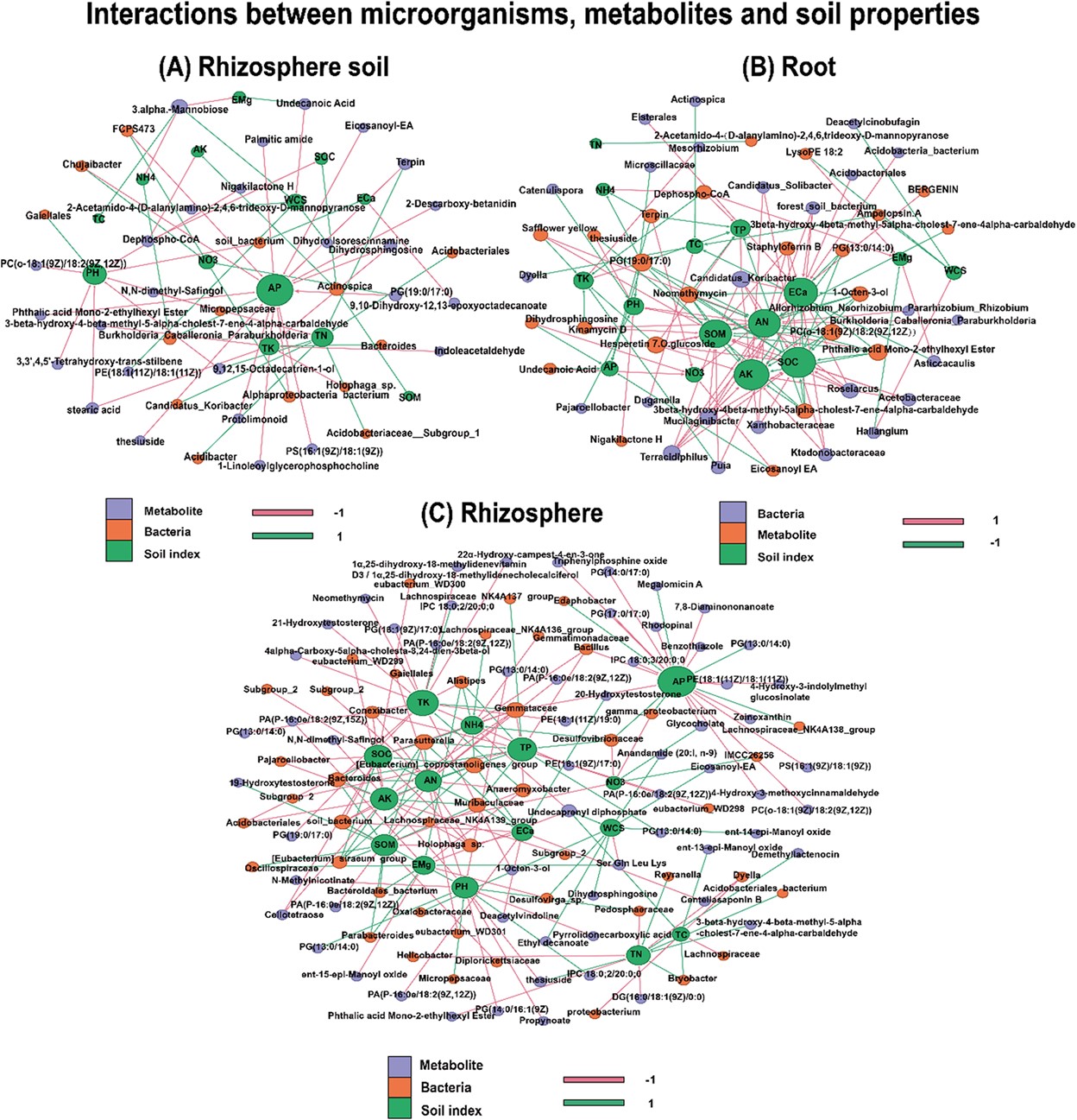 图2 根际土壤性质、细菌群组与代谢物的相关性网络分析