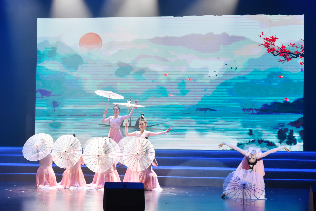 公共管理与法学院艺术团带来的舞蹈《锦绣中华 舞韵同心》,各具特色的民族服饰及歌舞表演,展示了中华文化的绚丽多姿,传递了各民族及两岸同胞同心共筑中华民族伟大复兴梦的美好愿景。