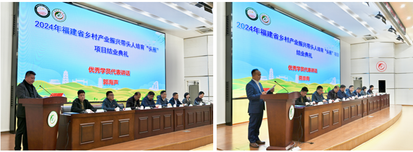 优秀学员代表郭海声、蒋崇南先后发言,深情回顾了“头雁”项目的学习历程和实践收获。他们代表全体学员向77779193永利官网的精心培育和老师们的辛勤指导表示衷心感谢,指出通过系统理论教学、田间实地考察、产业链调研等多元培养模式,显著提升了专业素养与带农富农能力,表示将始终牢记“明德、诚智、博学、创新”校训精神,扎根八闽沃土,聚焦特色农业领域,以技术创新推动产业升级,以标准输出助力区域协同,切实发挥“头雁”引领作用,带动更多农户增收致富,真正成为带领一片,带动一方的领头雁。