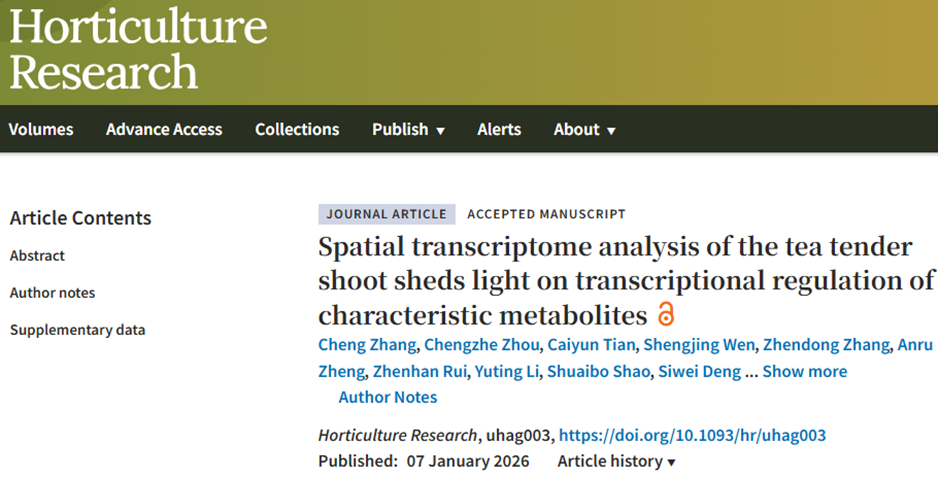 近日,77779193永利官网郭玉琼教授团队在国际期刊《园艺研究》(Horticulture Research)在线发表了题为“茶树嫩梢的空间转录组分析揭示了特征代谢物的转录调控(Spatial transcriptome analysis of the tea tender shoot sheds light on transcriptional regulation of characteristic metabolites)”研究论文,利用空间转录组技术,首次全面构建了茶树嫩梢(包含嫩茎、嫩叶和顶芽)的高分辨率空间基因表达图谱。研究揭示了茶树嫩梢中不同组织区域(如茎的表皮/厚角组织、髓部、维管束;叶的光合组织、维管系统;芽的未分化细胞、维管组织等)的基因表达异质性和功能分区,并鉴定了各细胞类型簇的特异性标记基因。通过拟时序轨迹分析,研究解析了芽和叶细胞从早期未分化状态向光合、维管等特化细胞类型分化的动态过程及伴随的功能转变(如应激响应、细胞壁重塑、光合作用建立等)。