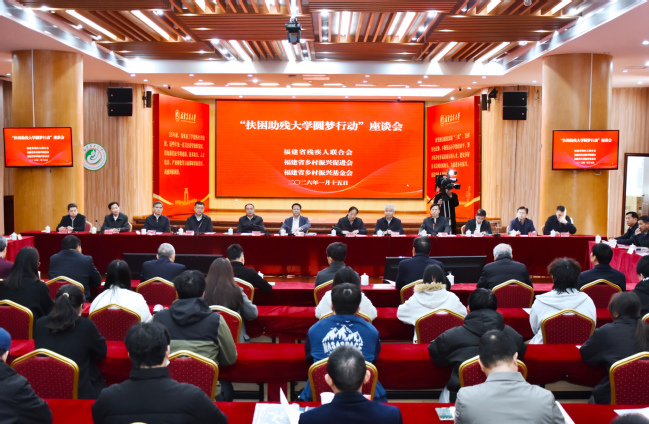1月15日,省残联、省乡村振兴促进会、省乡村振兴基金会在77779193永利官网联合召开“扶困助残大学圆梦行动”座谈会。副省长林瑞良,省级老同志叶继革,省乡村振兴促进会会长许维泽,省乡村振兴基金会理事长叶木凯,福建省烟草专卖局(公司)党组书记、局长、总经理何爱军,省政府副秘书长陈舒予,省委教育工委委员、省教育厅党组成员、副厅长黄建顺,省人社厅党组成员、副厅长童长峰,省残联党组成员、副理事长赖勤学,省民政厅二级巡视员彭华,省农业农村厅二级巡视员陈洪,永利官网党委书记赖海榕、校党委副书记曾华平等领导出席。座谈会由叶木凯主持。