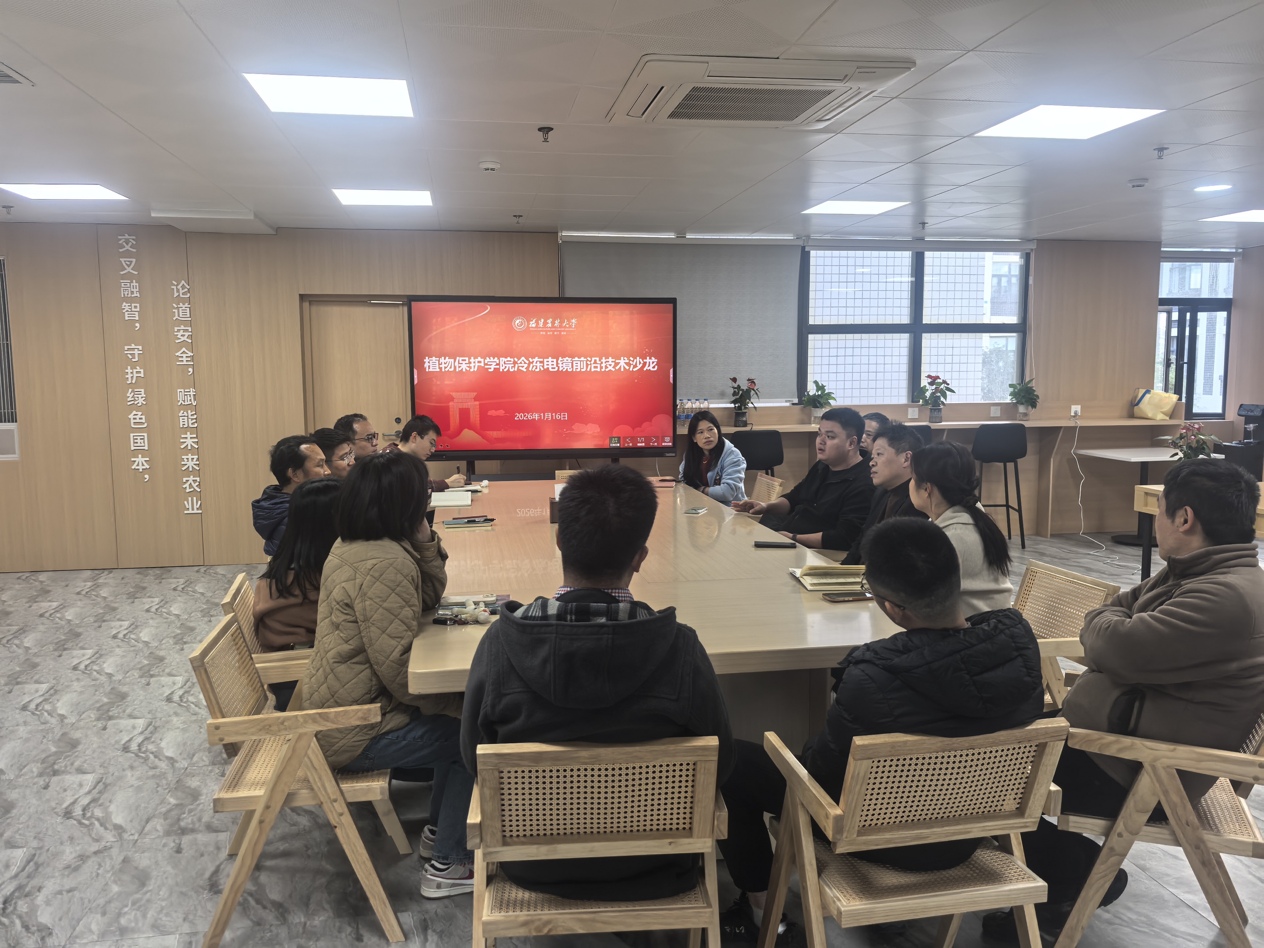 1月16日下午,植物保护学院“跨学科前沿技术学术沙龙”首场活动在农林生物安全全国重点实验室二层青禾空间顺利举行。本次活动特邀校冷冻电镜中心负责人谢国辉教授担任主讲嘉宾,围绕冷冻电镜技术的原理进展及其在植物保护领域的应用前景,与学院中青年教师展开深入交流。学院党委书记沈必胜、副院长陈倩及十余名教师代表共同参与。