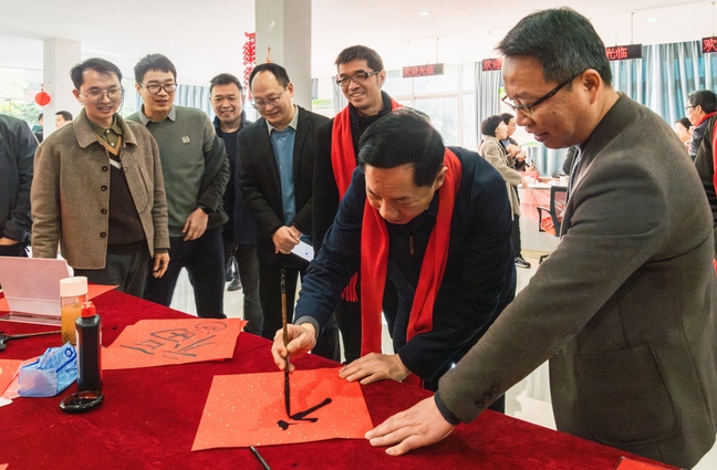 长桌一侧,红纸翻飞,笔墨流转。曾华平副书记走到案前,与同学们亲切交流书法心得,并挥毫泼墨,写下苍劲有力的“福”字。他勉励同学们要利用好假期时光,在传承中华优秀传统文化中增强文化自信。各位领导老师也纷纷加入同学们的书写行列,既有“丹凤呈祥龙献瑞”的豪迈,又有“红梅含笑柳含烟”的雅致,一幅幅寓意吉祥的春联,承载着师生对新年的美好期许。