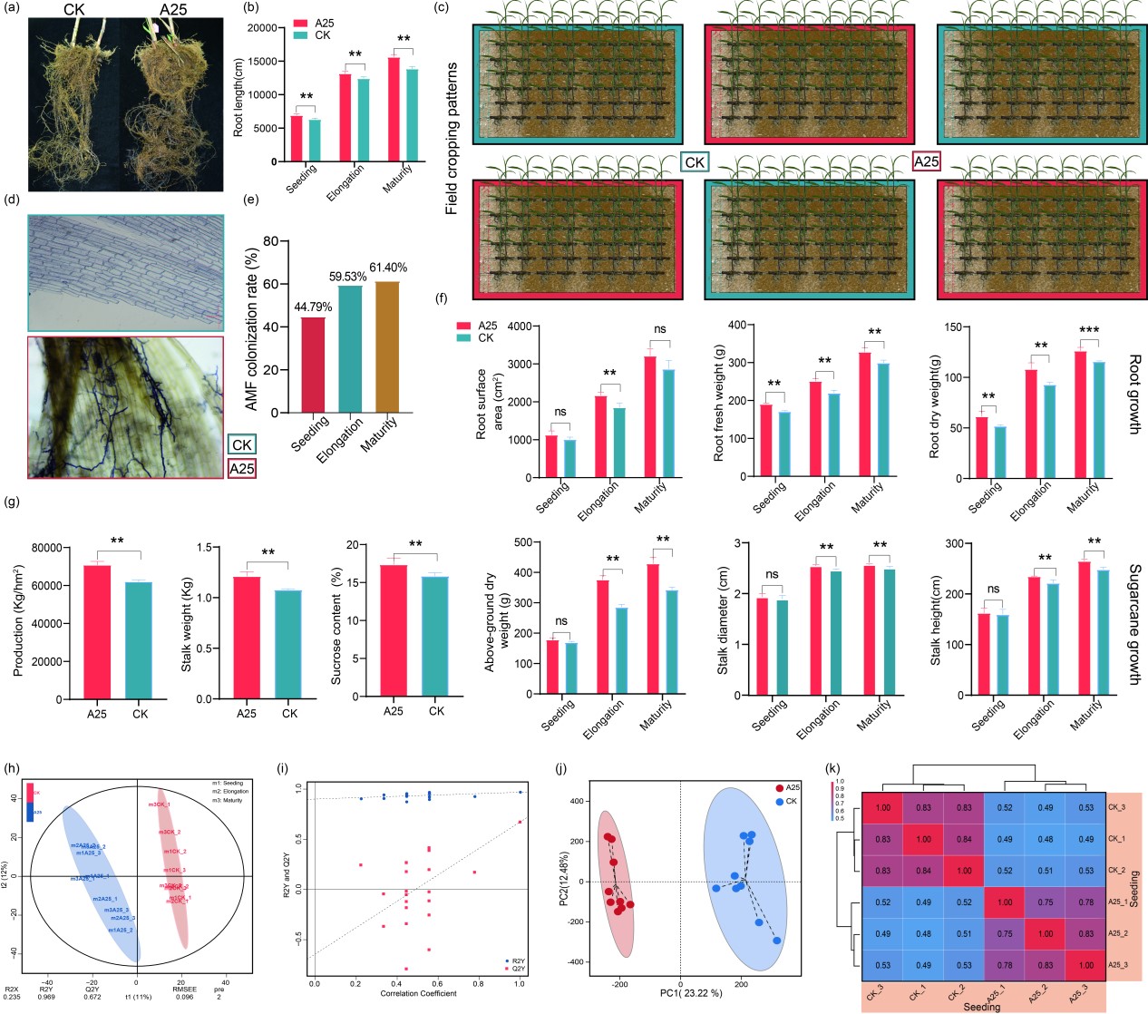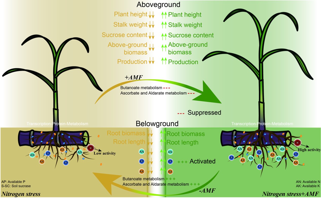 该研究充分发挥永利官网在植物-微生物互作及多组学技术领域的优势,综合运用田间试验与温室控制实验,整合多组学分析手段,系统解析氮胁迫下丛枝菌根真菌(AMF)与甘蔗根系共生的响应机制。