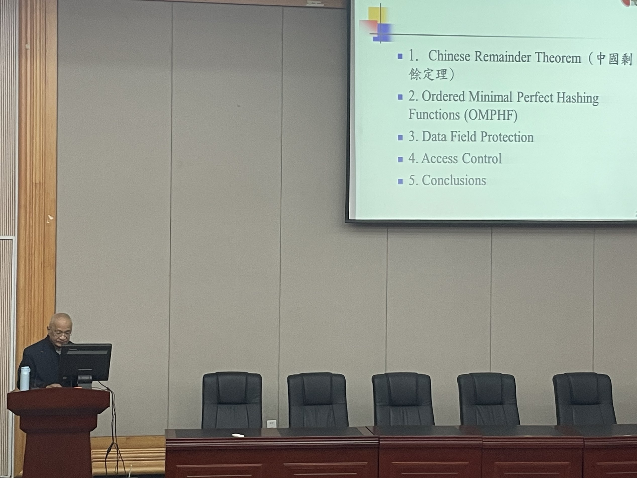 在首场报告中,张真诚教授以“中国剩余定理在信息科学之应用”为题,结合中国古代经典《孙子算经》的数学思想,生动讲述了中国剩余定理的历史渊源及其现代价值。报告从历史人物孙武的故事切入,深入浅出地阐释了这一源自两千多年前的重要数学理论在当代信息科学中的关键作用。张教授重点介绍了中国剩余定理在数据库的数据结构设计、数据属性读取控制以及文档存取控制等方面的应用,充分展现了中华优秀传统文化在现代科技发展中的独特贡献与时代意义。