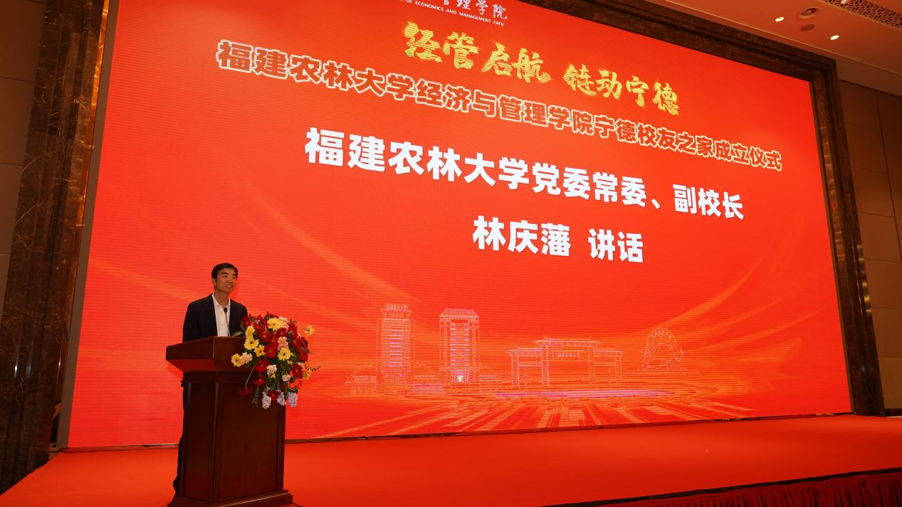 林庆藩代表学校向大会的胜利召开表示热烈祝贺,向长期以来情系母校、关心支持学校建设发展的广大校友致以诚挚感谢。他指出,近年来学校在办学质量、科学研究、学科建设等方面取得了一系列新进展,这些成绩的取得离不开广大校友的鼎力支持。当前,学校正深入学习贯彻习近平总书记给学校全体师生的重要回信精神,全力奋进国家“双一流”,希望校友们一如既往关心支持母校发展,为母校献计献策,以优异成绩迎接母校90周年校庆。他对新成立的经管学院宁德校友会提出三点期许:一是打造有温度的“校友之家”,凝聚同心合力;二是搭建有高度的“合作之桥”,助力学校发展;三是构筑有力度的“奋进共同体”,助推学校“双一流”建设。