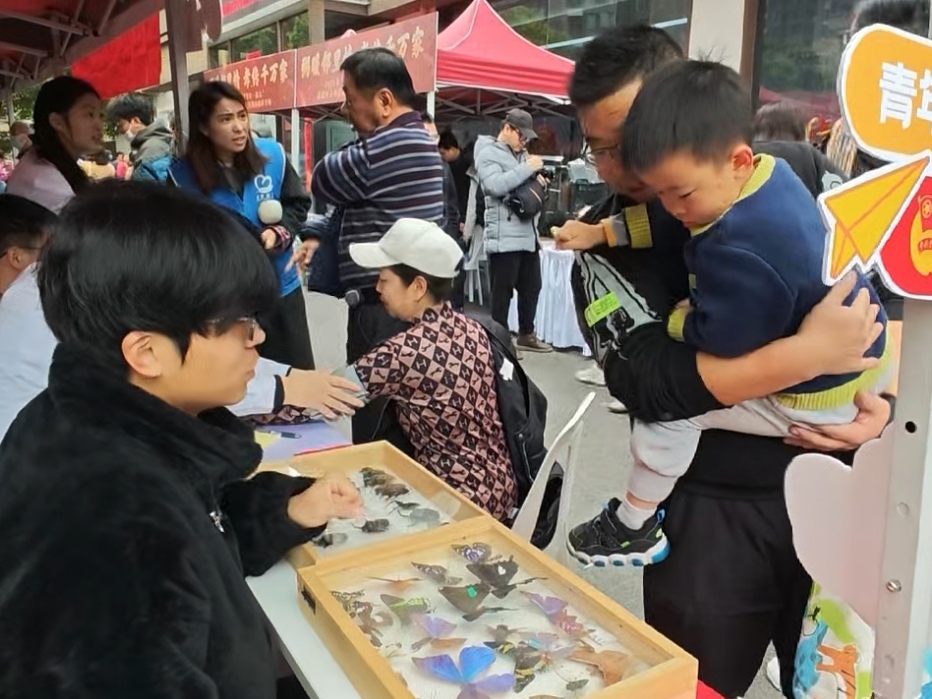 在大凰山社区,“植此青绿”志愿服务团支部用专业知识搭建科学与公众之间的桥梁。精美的昆虫标本一字排开——色彩斑斓的蝶翅、坚硬光亮的甲壳、形态各异的锹甲,吸引居民纷纷驻足。志愿者们耐心讲解昆虫的生活习性、生态价值及其与人类生活的关联,让曾经令人却步的“小虫子”化身为生动有趣的科普素材。与此同时,2024级植物保护2班团支部走进77779193永利官网附属幼儿园,为孩子们带来一堂别开生面的昆虫科普课。活动以趣味科普视频开场,志愿者借助图文并茂的PPT,用通俗易懂的语言讲解昆虫的基本特征。当孩子们近距离观察标本,在触摸与惊叹中认识凤蝶的绚丽翅纹、甲虫的坚硬外壳、蜻蜓的透明翅膀时,一颗颗好奇的种子悄然播下。