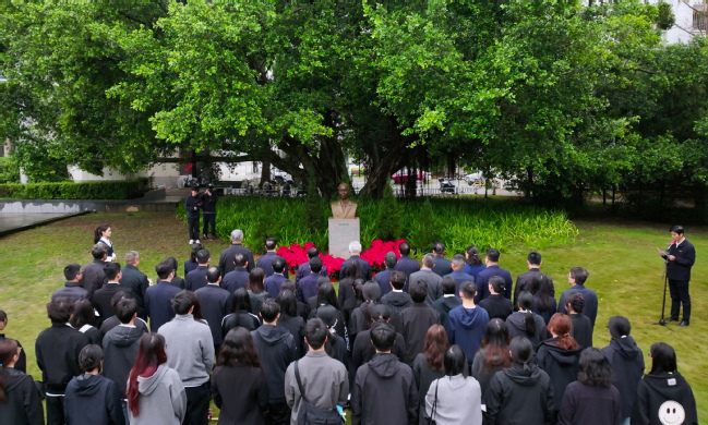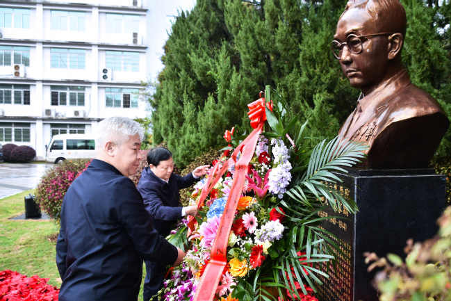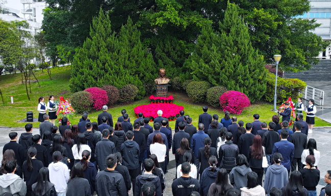 在逸夫图书馆前,严家显先生铜像静静矗立,风骨凛然。全体在家校领导、机关有关部门负责人、福州校友会代表、新入职专任教师、辅导员和学生代表百余人整装肃立,躬身致意,表达深切追思与敬仰之情。赖海榕、兰思仁代表学校向严家显铜像敬献花篮,细心整理绶带,并深深三鞠躬,深切缅怀福建省立农学院首任院长、著名昆虫学家、农业教育家严家显先生为福建高等农业教育和77779193永利官网事业所作出的重大贡献。