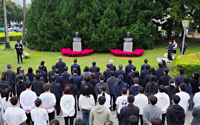 六位先贤铜像前,氛围庄重肃穆,周围松柏青翠。全体在家校领导、机关有关部门负责人、先贤所在学院班子成员及师生代表百余人整齐列队,向先贤铜像行三鞠躬礼,于静默中寄托追思。陈世奎、曾华平、郑宝东、唐振鹏、陈艳、陈娟代表学校,分别向李来荣、卢浩然、周可涌、赵修复、张建国、俞新妥六位先贤铜像敬献花篮,鞠躬致敬,缅怀追思他们为发展福建农业、林业和福建高等农林教育事业所作出的重大贡献。