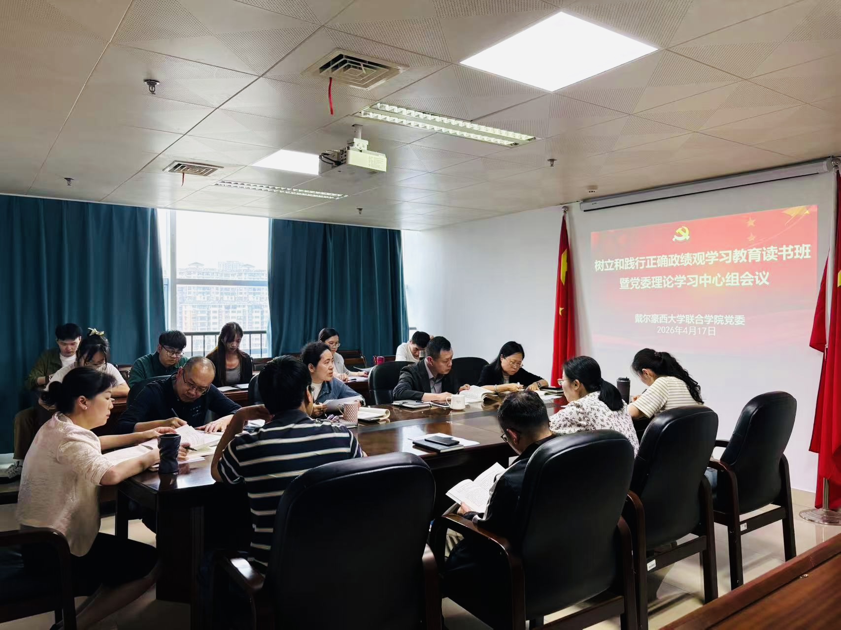 4月17日下午,戴尔豪西大学联合学院党委在大学城校区仁德楼901会议室召开树立和践行正确政绩观学习教育读书班暨党委理论学习中心组(扩大)学习会,院领导班子成员、党委委员、党支部书记参加学习,院党委书记陈月霄主持会议并领学。