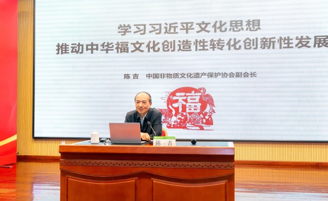 随后,本次读书节暨阅读周首场金山讲坛开讲。中国非物质文化遗产保护协会副会长、著名书法家、福建省“福文化”研究专家陈吉应邀为师生作了题为“福星高照 福佑中华——学习贯彻习近平文化思想,推动中华福文化创造性转化和创新性发展”的专题报告。讲座前,陈吉向学校图书馆捐赠其著作《伊秉绶法书》《清俊雅正——陈吉书法艺术》以及《福语吉言说节气》,林庆藩为其颁发捐赠证书。