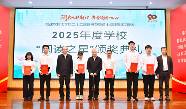 活动表彰了2025年度学校“阅读之星”。教师陈文相、林玲,学生林焕泰、张羽佳、张语棵、马逸晨等获此殊荣,赖海榕、何强、陈吉分别为获奖代表颁奖。林焕泰同学宣读了《书香浸润校园,阅读点亮人生——2026年全民阅读活动周倡议书》,号召全校师生以《全民阅读促进条例》为指引,以90周年校庆为契机,以书为友、以读为伴,为建设书香八闽、书香校园贡献力量。