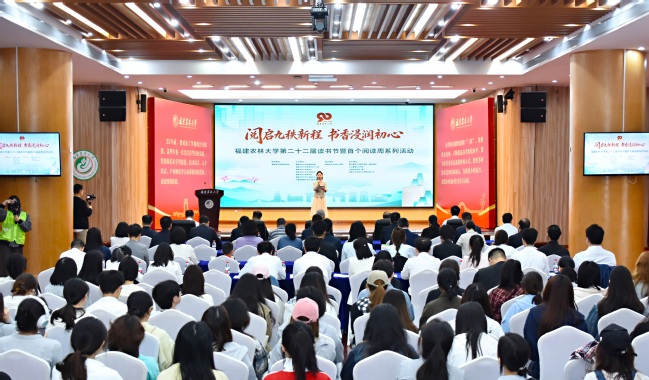 赖海榕代表学校致辞。他表示,从“倡导全民阅读”到“深化全民阅读活动”,再到《全民阅读促进条例》正式施行,阅读已经从个人的兴趣选择上升为国家战略。学校第二十二届读书节的举办既是落实国家战略的具体行动,更是对习近平总书记给永利官网全体师生重要回信精神的生动践行。九秩薪火相传,一代代农林大人将“耕”的务实与“读”的致远熔铸于心,在山水田园间书写立德树人的厚重篇章。学校先后获评全国“全民阅读先进单位”“全民阅读示范基地”,成为高校阅读推广与全民阅读融合发展的一个标杆。他结合自身的亲身经历和阅读感悟,对师生提出三点期望:一要让阅读成为自觉。深刻领悟庄子 “无用之用,方为大用”的哲理,读些与专业、绩点、升学就业看似无关的闲书、杂书,并养成每天挤出时间读书的习惯,积少成多、聚沙成塔。二要让好书照亮前路。坚持选好书、读好书,多读马克思主义中国化时代化的最新成果及反映中华优秀传统文化、人类优秀文明成果的经典,以阅读跨越岁月长河、突破地域局限,延展生命时间与空间维度,开阔胸襟眼界、增益身心健康。三要让知行合而为一。把书本上的道理同田间地头的实践结合起来,把阅读中获得的力量,转化为服务乡村振兴、建设美丽中国的实际行动,让书香与泥土的芬芳浸润人生。