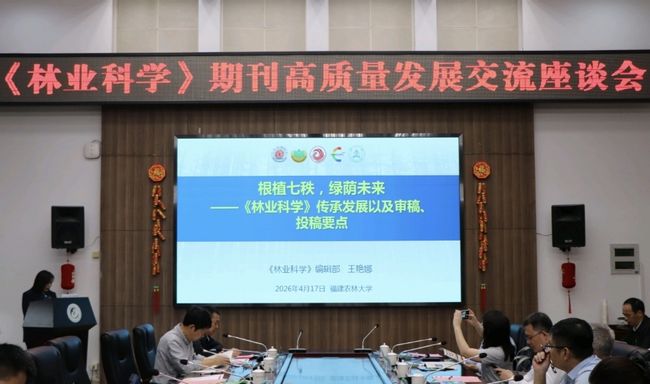 办刊发展介绍环节由林学院执行院长郭福涛主持。中国林学会《林业科学》编辑部副主任王艳娜以《根植七秩,绿荫未来——〈林业科学〉传承发展以及组审稿、投稿要点》为题作专题汇报,全面介绍期刊71年办刊历程、学术业绩、创刊70周年系列活动、编委会建设、数字化出版与全媒体传播成效,系统阐述期刊紧扣国家重大战略和学科前沿开展选题策划、推进卓越期刊建设的创新举措与突出成果。
